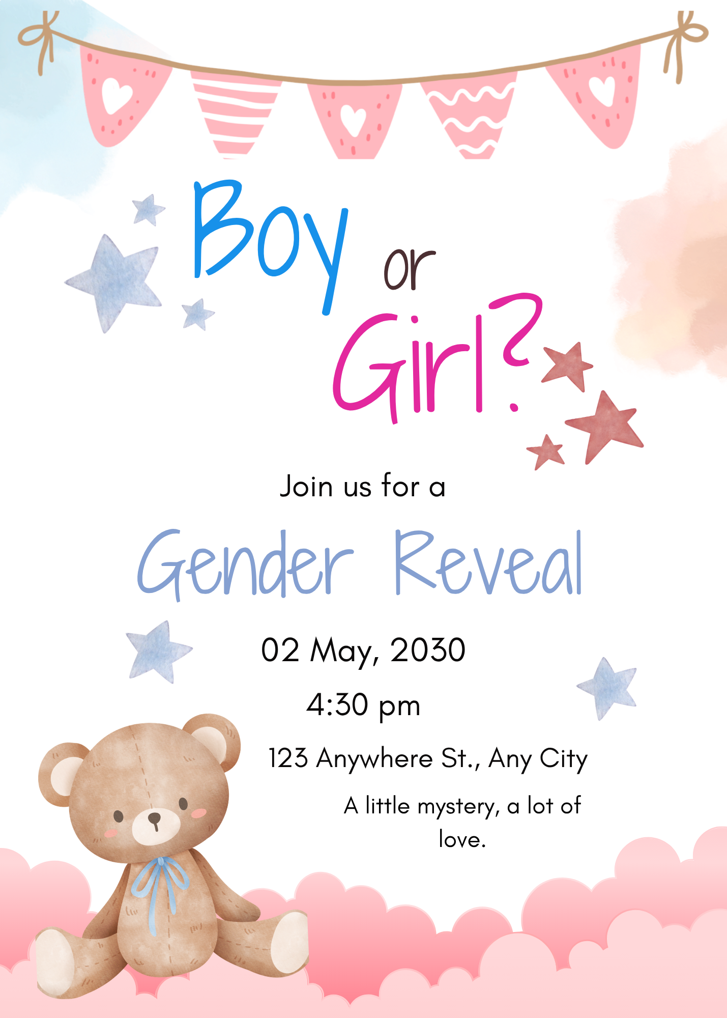 A charming and cozy invitation filled with light colors, cute details, and a friendly teddy bear, creating a lovely way to celebrate the big reveal.